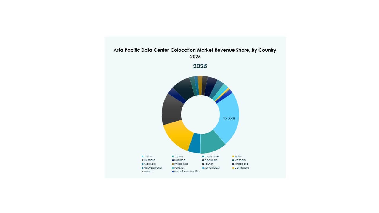 South Asia and Oceania collectively hold 32% of the Asia Pacific Data Center Colocation Market. India, Australia, and New Zealand are driving growth through expanding hyperscale footprints and rising enterprise demand. India’s digital ecosystem is maturing rapidly with strong government support and private investments. Australia and New Zealand are leveraging renewable energy resources to build sustainable data infrastructure. This subregion plays a strategic role in regional redundancy, resilience, and capacity expansion.