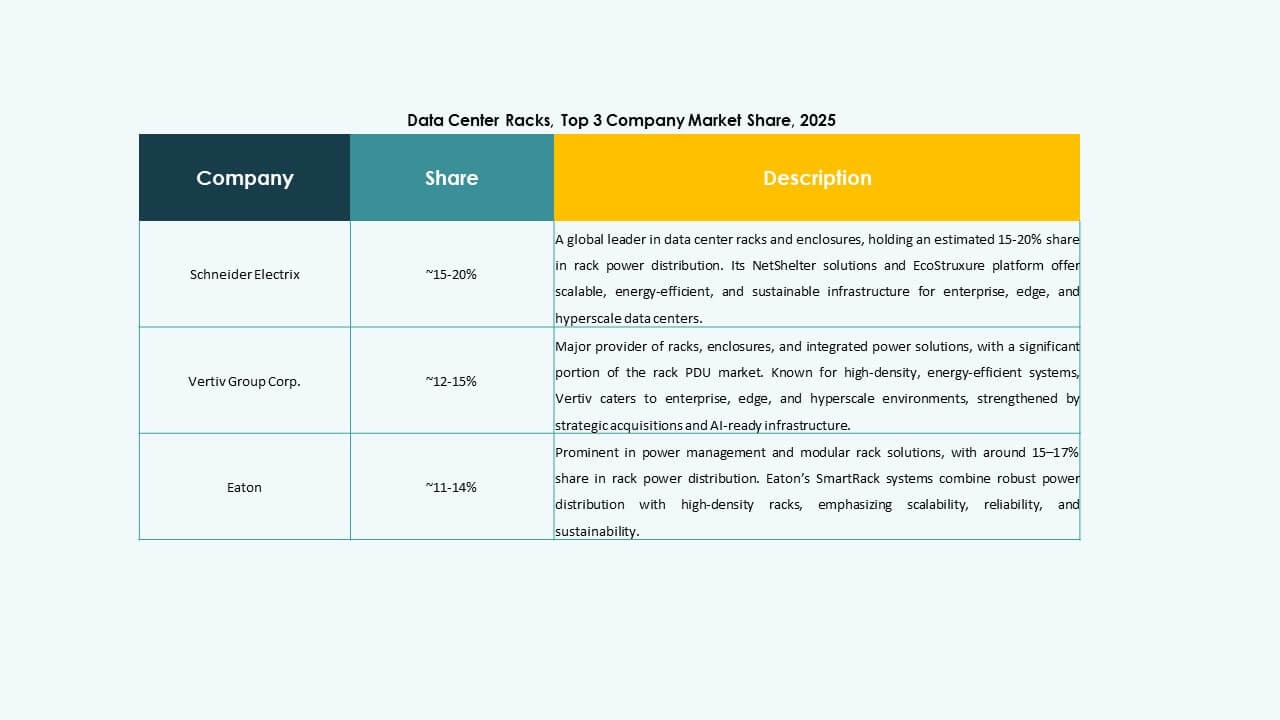 - In May 2025, Vertiv announced a USD 200 million acquisition of Great Lakes Data Racks & Cabinets, based in Edinboro, Pennsylvania, to bolster its pre-engineered rack solutions tailored for AI and edge computing, particularly enhancing high-density and liquid-cooled rack infrastructure.