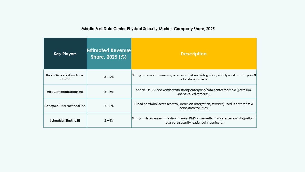 The competitive landscape centers around established security solution providers expanding presence in the Middle East. Leading vendors offer comprehensive portfolios—surveillance cameras, biometric access, integrated monitoring, and managed services. Companies like Bosch and Honeywell leverage global experience to assure reliability and compliance. Schneider Electric and Siemens deliver integrated infrastructure and energy-efficient security systems. Vendors such as Axis, Genetec, Cisco, and ABB compete by offering scalable video and network-based solutions tailored for large and hyperscale data centers. The market rewards firms that combine robust technology, local compliance knowledge, and service support. Strong competition encourages innovation and pushes vendors to offer differentiated, high-value security packages to attract data center operators and investors.